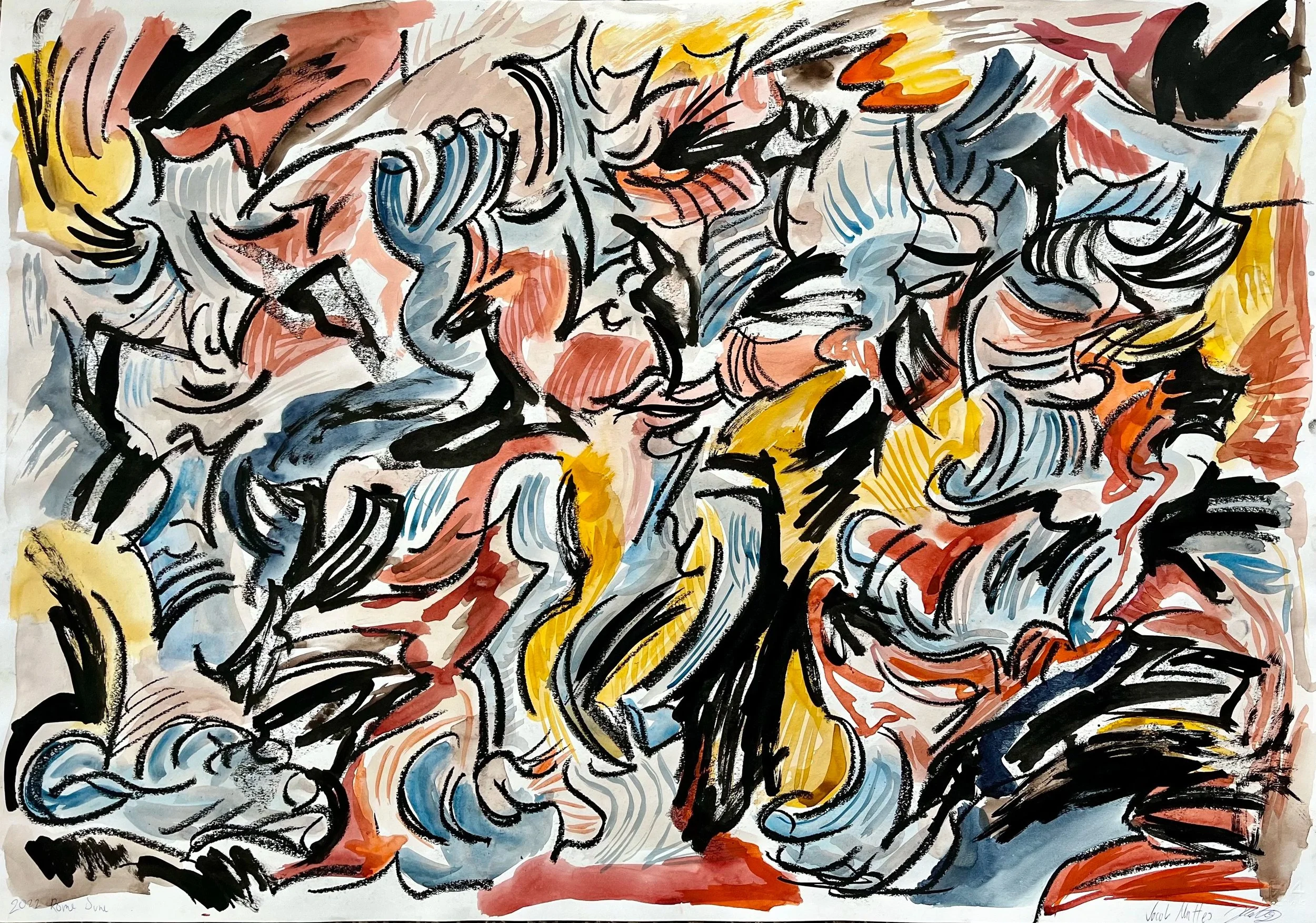 Material und Technik: Mischtechnik mit Pastellkreide, Aquarell, Tusche und Ölkreide auf Papier