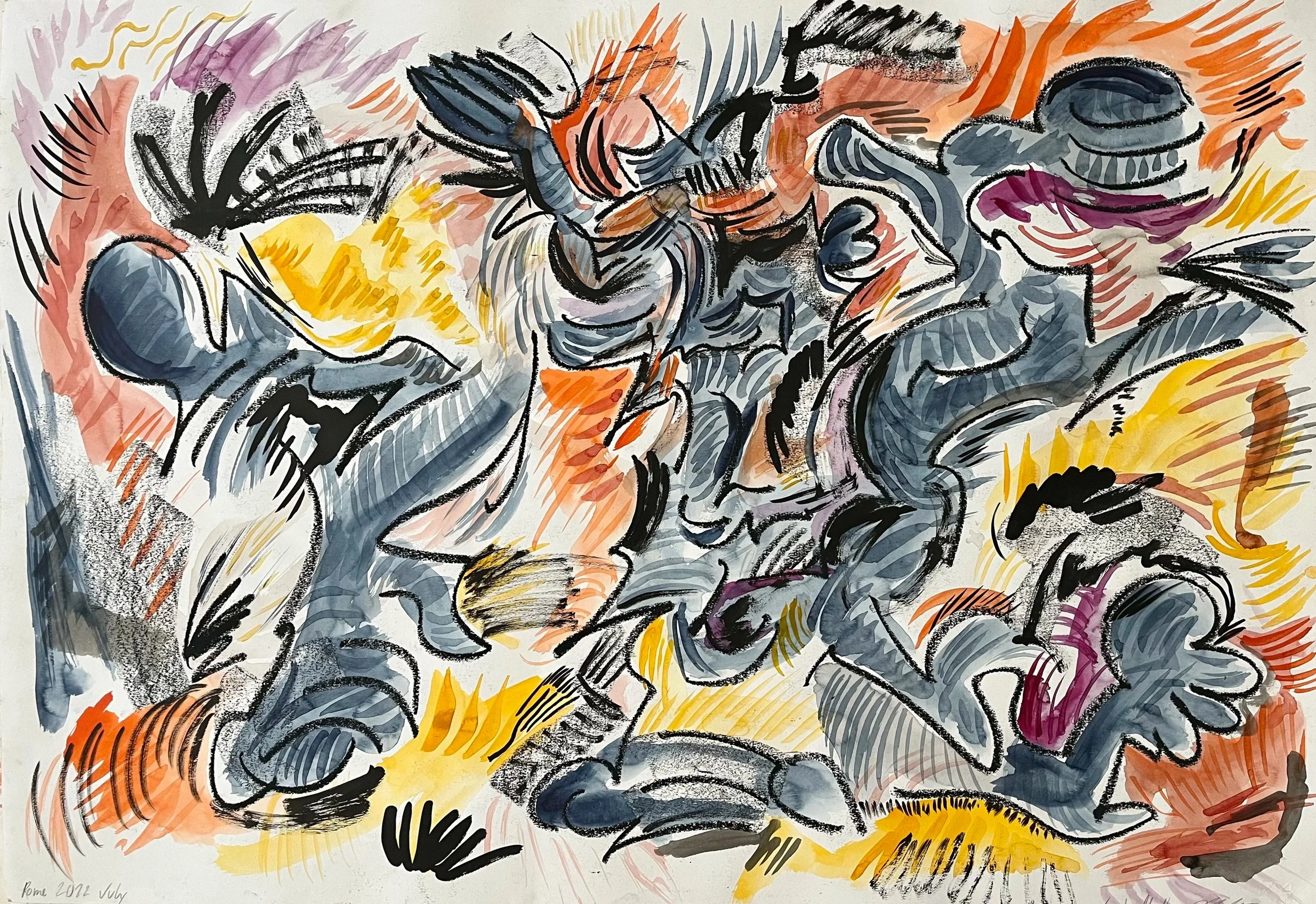 Material und Technik: Mischtechnik mit Pastellkreide, Aquarell, Tusche und Ölkreide auf Papier